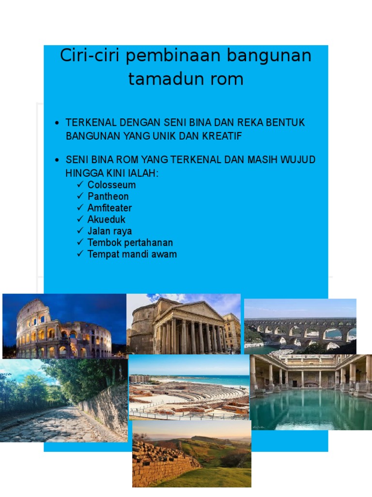 Ciri ciri jalan raya tamadun rom. 6 1 tamadun yunani 1 lokasi dan perkembangannya tamadun yunani berkembang di semenanjung greece dan pulau pulau yang bertaburan di laut aegean dan mediterranean. Seni bina rom purba mengguna pakai bahasa luaran seni bina yunani klasik untuk tujuan orang rom kuno tetapi berbeza dengan bangunan yunani menjadi gaya seni bina yang baru. Seni bina rom yang terkenal dan masih kekal hingga hari ini ialah colosseum pantheon amfiteater akueduk jalan raya tembok pertahanan dan tempat mandi awam.