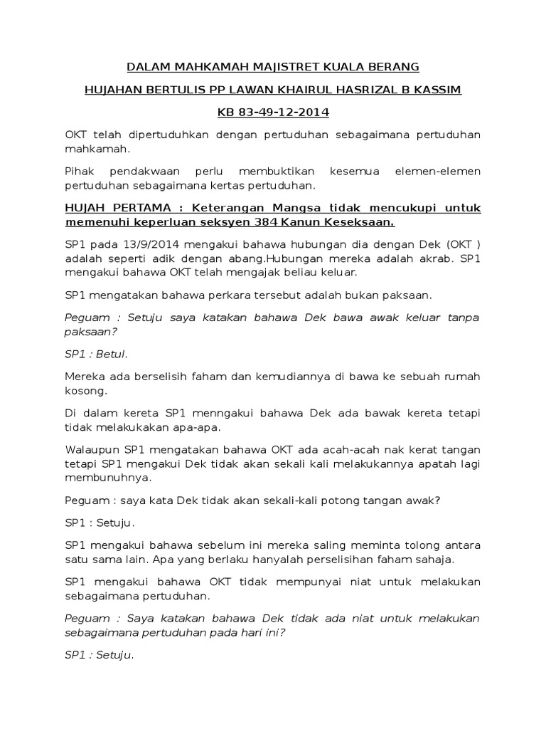 Contoh Hujahan Bertulis Peguam Kes Jenayah