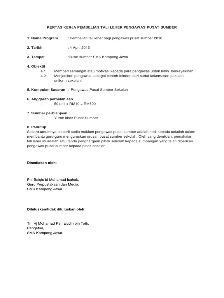 Kertas Kerja Pembelian Tali Leher Pengawas Pusat Sumber