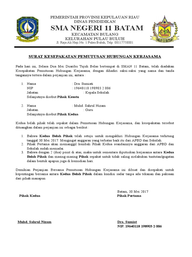 Contoh Surat Pemutusan Hubungan Kerjasama Dengan Vendor Contoh Seputar Surat