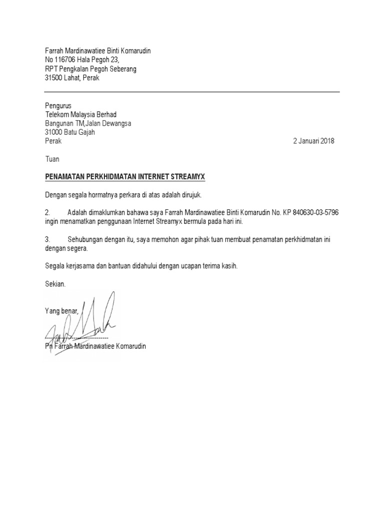 Contoh Surat Penamatan Perkhidmatan Telekom