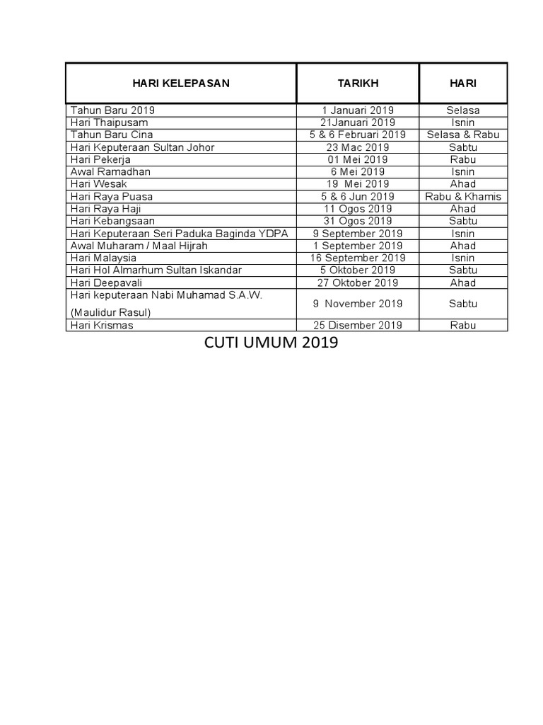 Terlebih bagi yang merencanakan sebuah event seperti pernikahan anniversary atau hanya liburan biasa dengan teman atau keluarga di bulan kesembilan tahun depan. Laman ini mengandungi kalendar cuti umum untuk tahun 2019 di malaysia. Sila semak laman web ini untuk maklumat terkini.