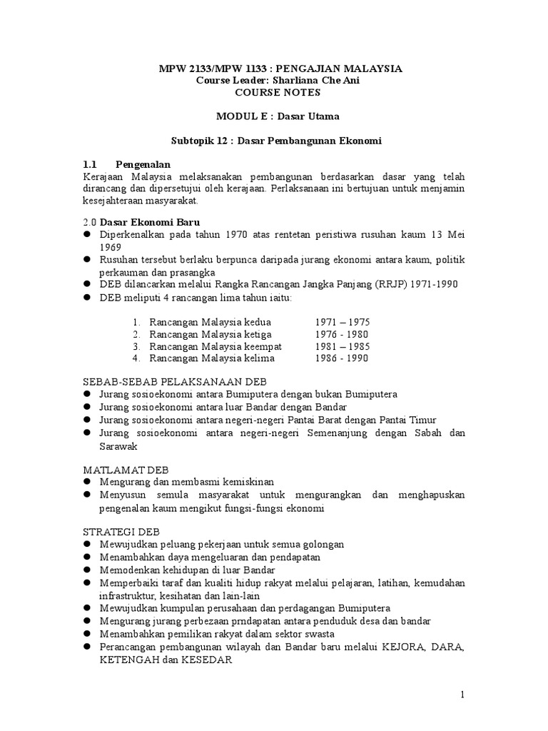 Mpw 2133 Mpw 1133 Pengajian Malaysia Course Leader Sharliana Che Ani Course Notes Modul E Dasar Utama Subtopik 12 Dasar Pembangunan Ekonomi 1 1 Pengenalan