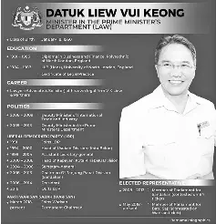Zachary david liew vui keong was a malaysian politician who served as the minister in the prime minister s department in charge of legal affairs in the pakatan harapan administration under former prime minister mahathir mohamad from july 2018 to the collapse of the administration in february 2020 and deputy minister in the prime minister s department also in charge of legal affairs as well as deputy minister of international trade and industry i in the barisan nasional administration under forme. Member of parliament for batu sapi sabah permanent chairman of parti warisan sabah. Batu sapi mp datuk liew vui keong has died believed to be from a lung infection at about 11 40am on friday oct 2.