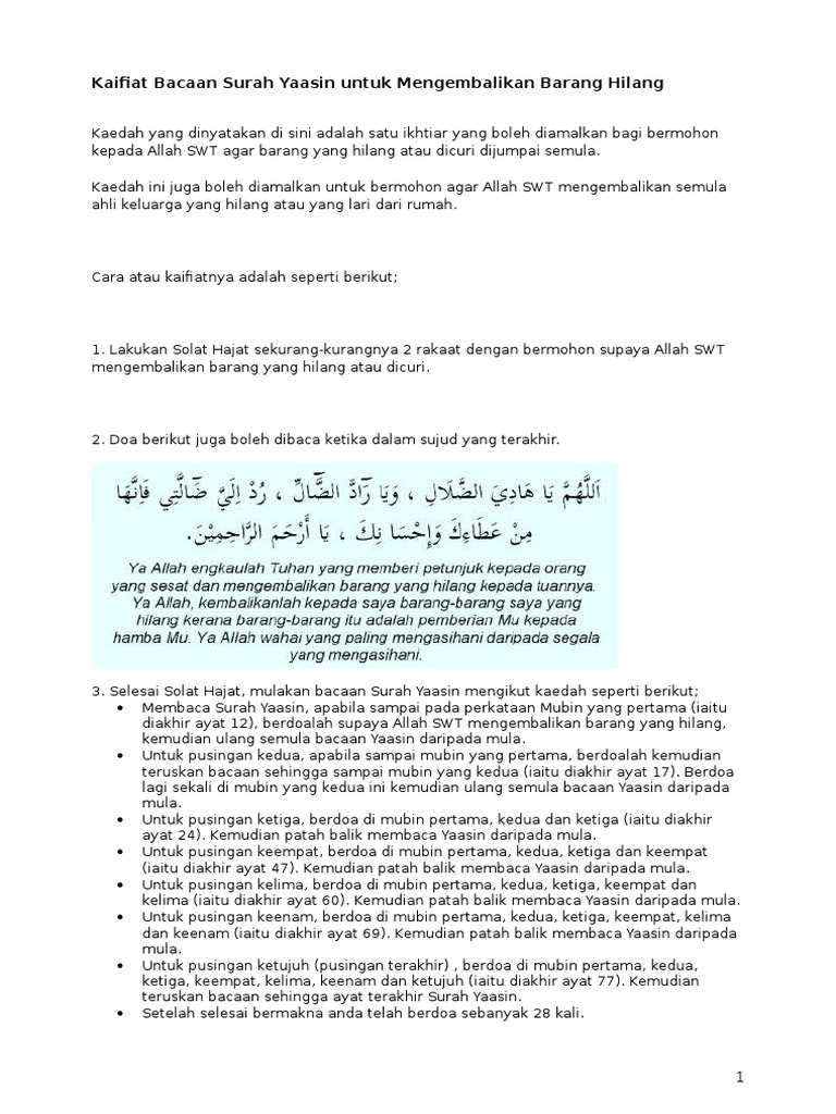 Kaifiat Bacaan Surah Yaasin Untuk Mengembalikan Barang Hilang Docx