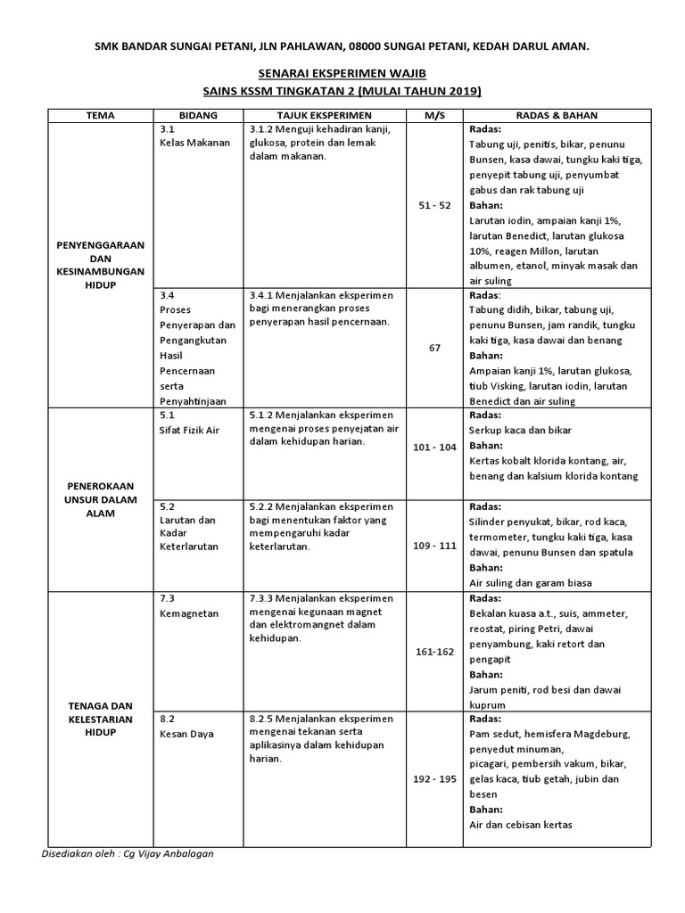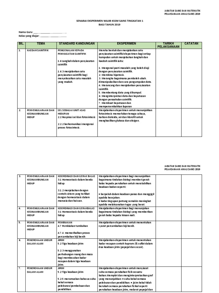 Senarai Eksperimen Wajib Kssm Sains Tingkatan 1