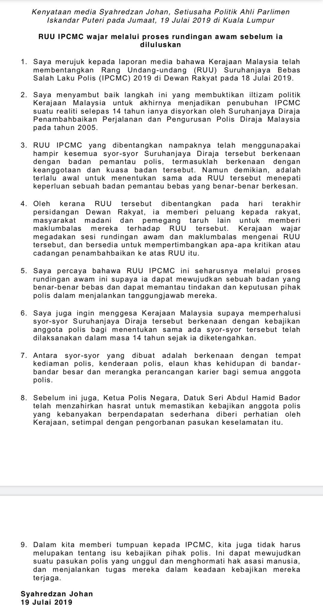 Syahredzan Johan On Twitter My Press Statement In Bm As Usual About The Need For A Consultation Process On The Bill And To Look Into The Welfare Of The Police Https T Co Nmarhbplwz