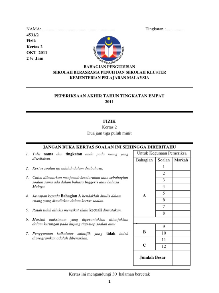 Fizik Kertas 2 Peperiksaan Akhir Tahun Sbp 2011 Ting 4